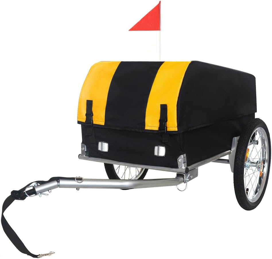 Maximize your biking experience with this durable bike cargo trailer designed for everyday use and outdoor adventures. The spacious 27.2 inch by 18.9 inch by 13.4 inch cargo area provides ample room for groceries, camping equipment, sports gear, or bulky items—making it ideal for families, cyclists, and outdoor enthusiasts. Built with a strong steel frame and rust-resistant finish, this trailer ensures long-term durability even in changing weather conditions. The high-density oxford fabric with waterproof coating protects your belongings from rain, snow, and splashes, while the removable cover allows for easy cleaning and extended usability. Equipped with 16 inch all-terrain tires, this cargo trailer delivers smooth rolling over pavement, gravel, dirt paths, and uneven surfaces. The shock-absorbing wheels reduce vibration, offering a stable and balanced ride even when fully loaded. Integrated reflectors enhance visibility during low-light conditions, improving safety on the go. The foldable design allows for quick disassembly and compact storage—perfect for small apartments, garages, or car trunks. The universal hitch system fits most bikes with whee Foldable Design for Grocery Hauling, Camping Gear, Outdoor Adventures, Yellow and Black