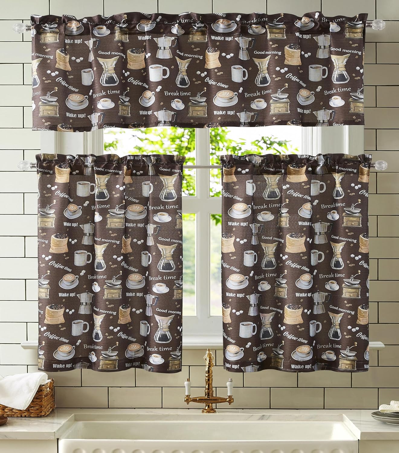 Introducing our Espresso Delight Kitchen Curtain Set - a tasteful blend of style and functionality to elevate your kitchen ambiance. This set features an enchanting print of espresso cups and Frappuccinos, adding a touch of coffee shop charm to your culinary space. The ensemble includes a stylish valance measuring 52 inches by 18 inches, and two coordinating tiers, each measuring 26 inches by 36 inches.