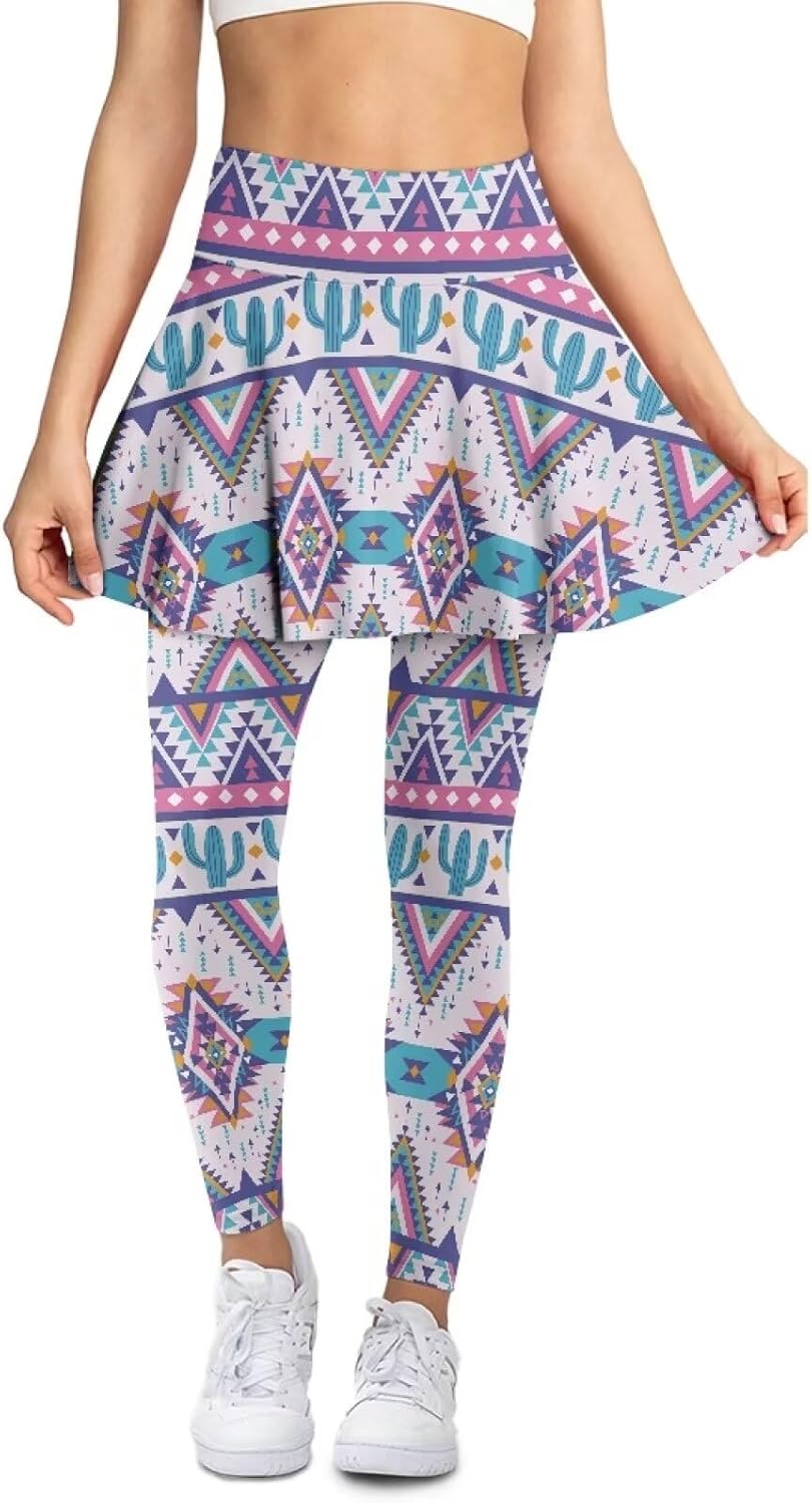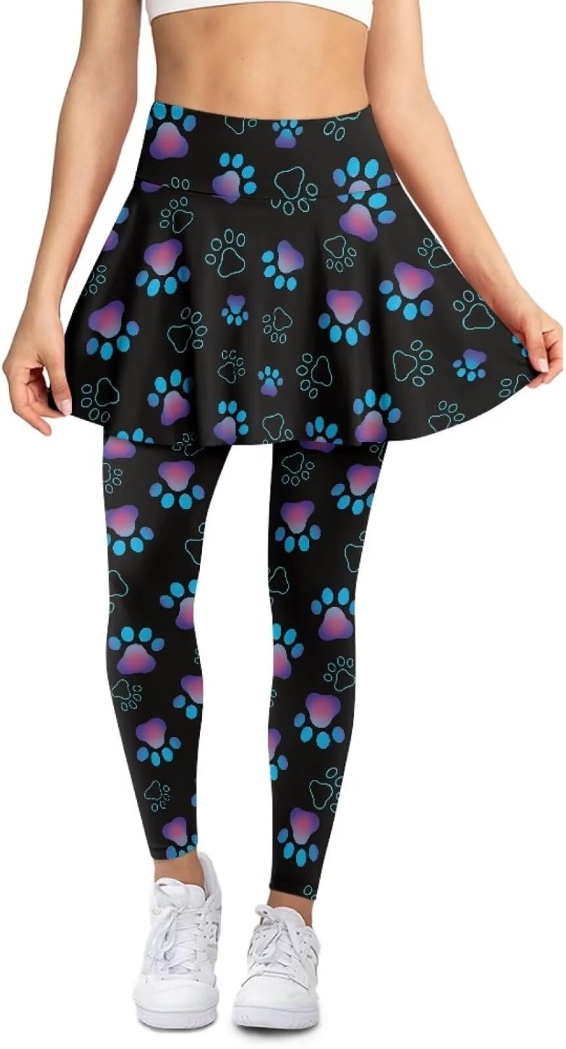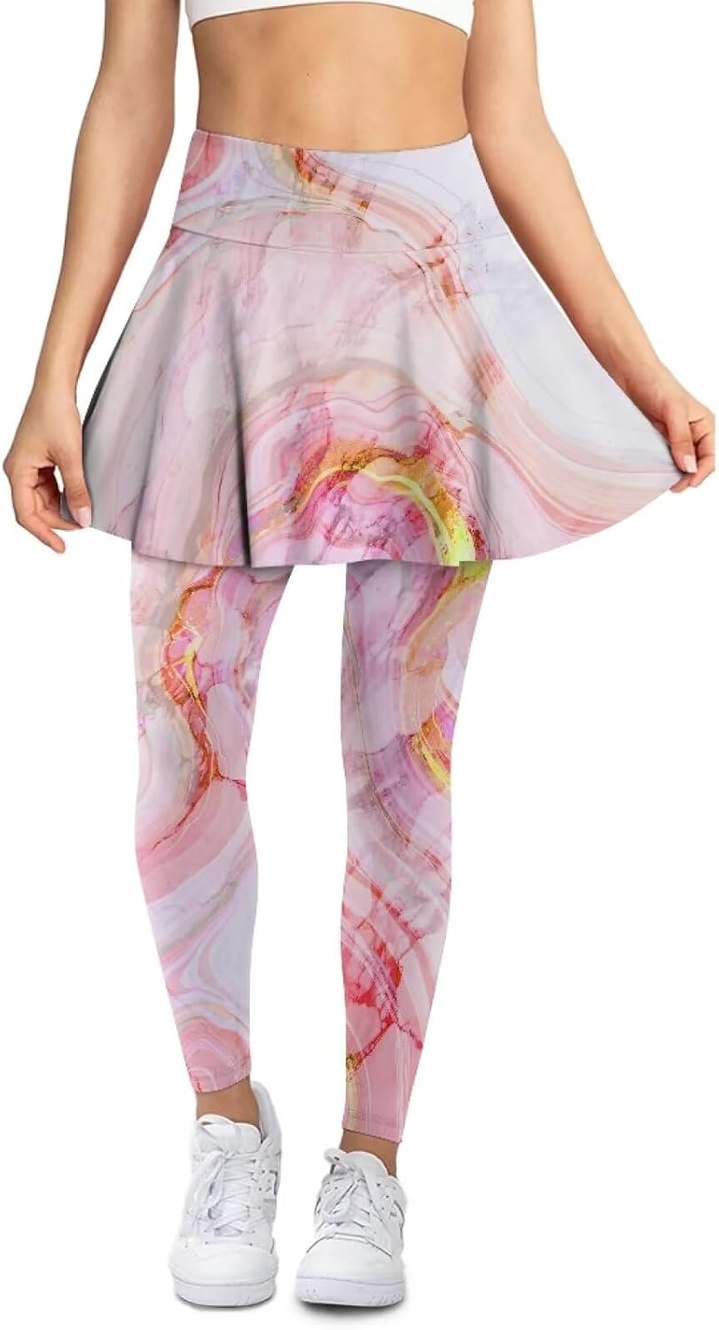 The yoga skirts are made of polyester and spandex, it's soft elastic and breathable. The material not only feels soft to the touch but also has well moisture-wicking properties. This ensures that you stay dry and comfortable, even during intense workouts. Our yoga pants have tight leggings as lining, the thick and non-transparent material enhances privacy protection. It improves comfort, strengthens support and shaping effects. It makes the overall look more flattering and beautiful. A hidden pocket at the back waist of the skirt allows you to carry small items conveniently. We have a wide range of sizes, suitable for people of most height and stature. We have adopted a fashionable high-waist design that helps to subtly conceal the abdomen and keep the garment in place, providing a snug and comfortable fit.By using the production process of thermal transfer printing, the patterns on our skirt leggings are more vivid and diverse, unlike ordinary solid color yoga pants, colorful patterns can reflect your fashion taste and express your unique fashion charm. Our product is suitable for many occasions. Whether it's tennis, golf, athletics, hiking, running or gym, workout, yoga, dance and pickle ball, our yoga pants are a great choice.